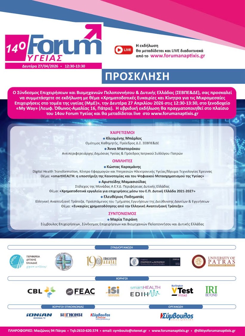 ΣΕΒΠΕ&ΔΕ | Πρόσκληση στην εκδήλωσή μας με θέμα: «Χρηματοδοτικές Ευκαιρίες και Κίνητρα για τις Μικρομεσαίες Επιχειρήσεις στο τομέα της υγείας (ΜμΕ)», στο πλαίσιο υλοποίησης του ευρωπαϊκού προγράμματος smartHEALTH-EDIH